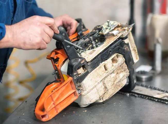 チェーンの状態を確認し、必要に応じて調整や交換を行います。ガイドバーについても細かく点検し、損傷が見られる場合には修理または交換を行います。さらに、オイルが適切に供給されるようにシステムを点検し、使用方法の見直しや日常的なメンテナンス方法をアドバイスいたします。